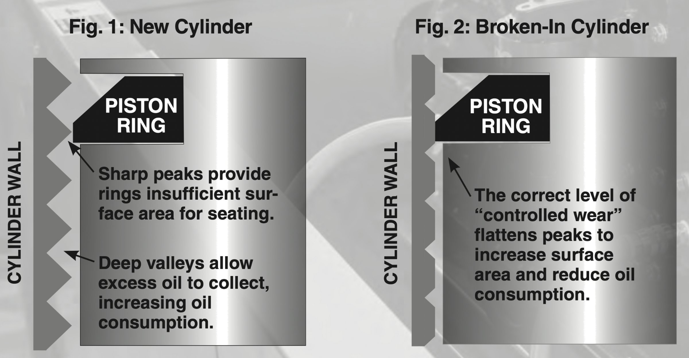 Freedom Series Break-In Oil's friction-modifier-free formula allows the sharp peaks on newly honed cylinder walls (fig. 1) to partially flatten. The result produces more surface area for rings to seat against, allowing the formation of a dynamic seal that increases compression, horsepower and torque (fig. 2).