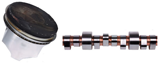 | The piston crown contains normal carbon, while the rings remain clean and functional. Note the absence of wear or scuffing on the piston skirt. | The camshaft shows little-to-no scoring, bluing or wear after 3,000 miles of high-performance racing. |